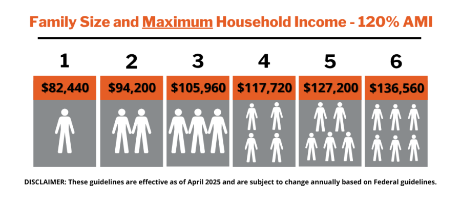 Income must be at or below 120% AMI (Area Median Income). See maximum income chart below.