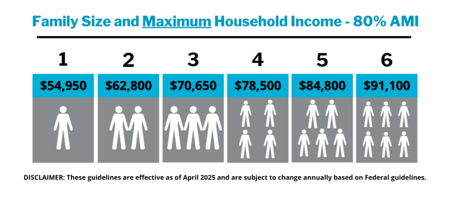 Income must be at or below 80% AMI (Area Median Income). See maximum income chart below.