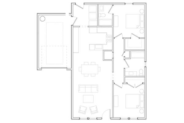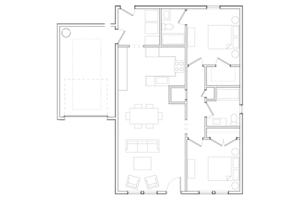 This two bedroom, two bathroom floor plan is the perfect option for individuals and smaller family units to call home.
