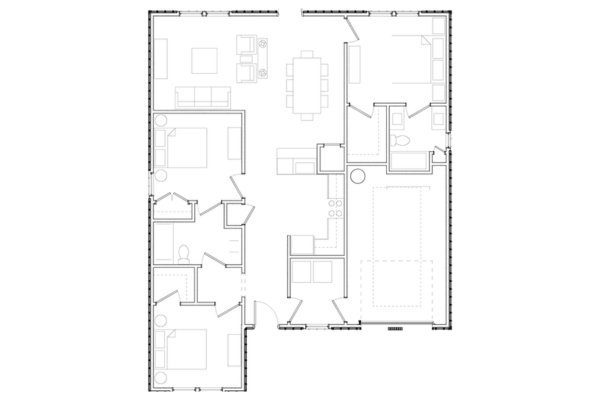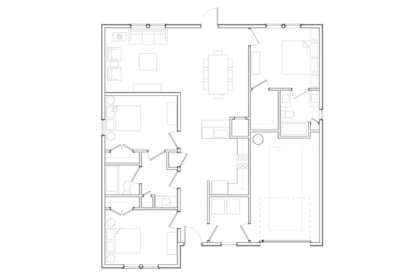 This three bedroom, two bathroom floor plan is the perfect option for medium sized families.